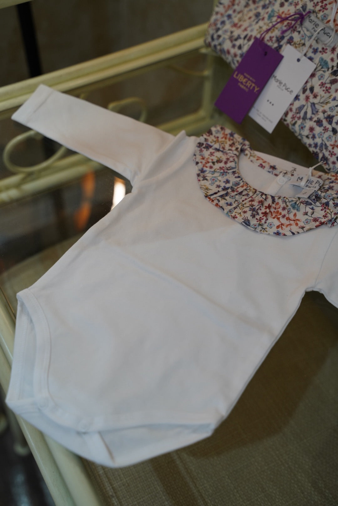 真っ白なコットンボディに、ポーチとお揃いのリバティ生地のフリル襟をあしらった一枚。 写真映えする華やかさと、普段使いできる上質な肌触りを両立しています。