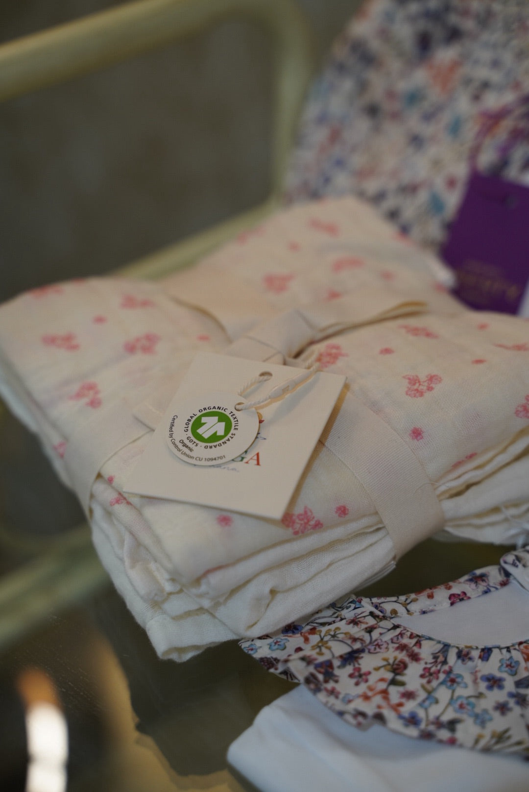 GOTS認証のオーガニックコットン100%。やわらかなピンクのフローラル柄と、無地のナチュラルカラー。 赤ちゃんのお肌に、そっと寄り添う優しさです。