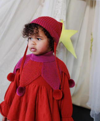 - ポンポン&タイ付きの“とんがり帽”で愛らしいアクセント