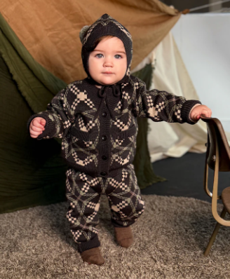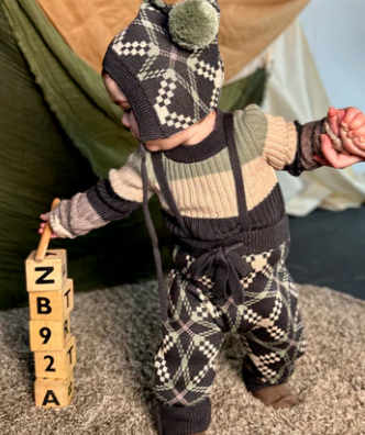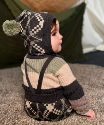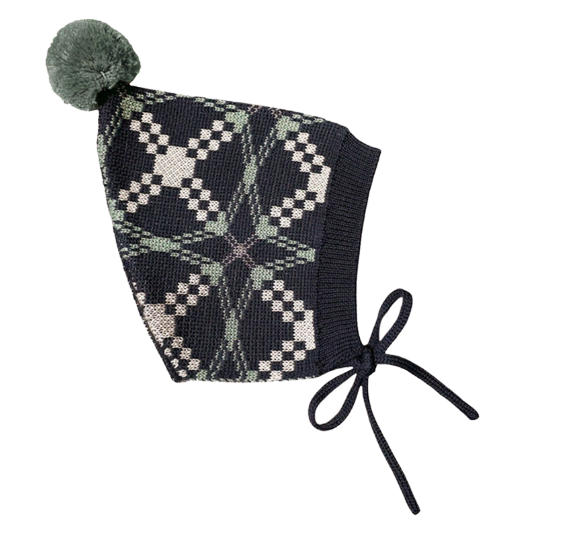 ピクシーのようなとんがりシルエットに、ふわふわポンポン&やさしく結べるタイ付き。ミッドウェイトのジャカード編みで、秋冬の装いに温もりと遊び心を添えるボンネットです。ウェールズのヴィンテージ・タペストリーに着想を得た〈Sêr〉パターンがポイント。