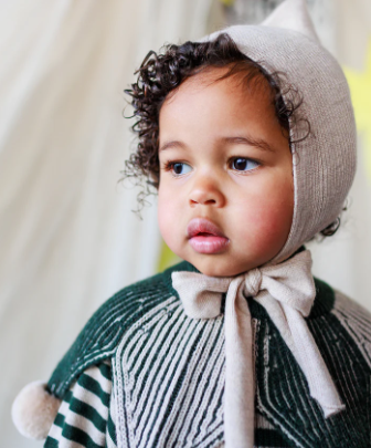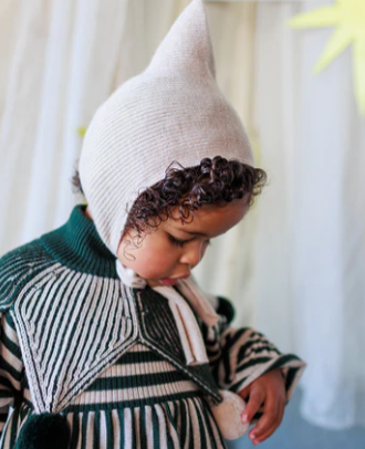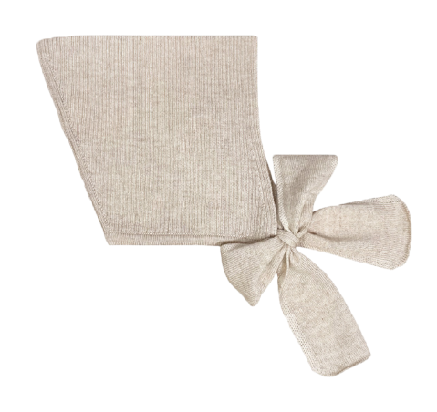 ファインニットの“とんがり”シルエットに、きれいなリボン結びができるワイドなタイ付き。顔まわりをやさしく包む、秋冬の定番ピクシーボンネットです。