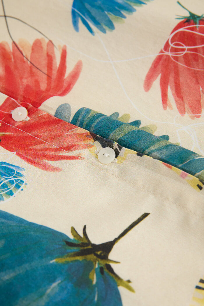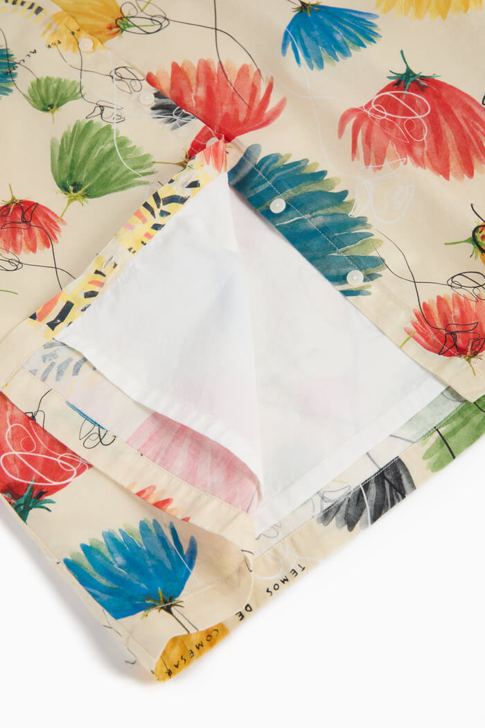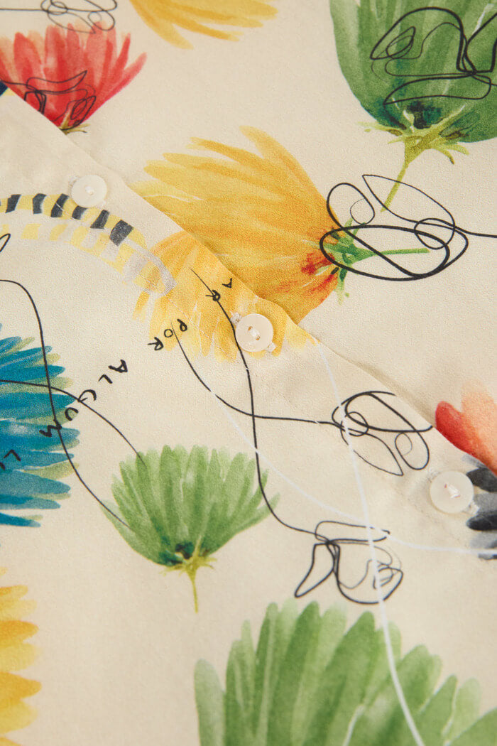 水彩画のように描かれたカラフルなフラワーモチーフに、手描き風のラインアートを重ねた、ブランドらしいアーティスティックな一枚です。